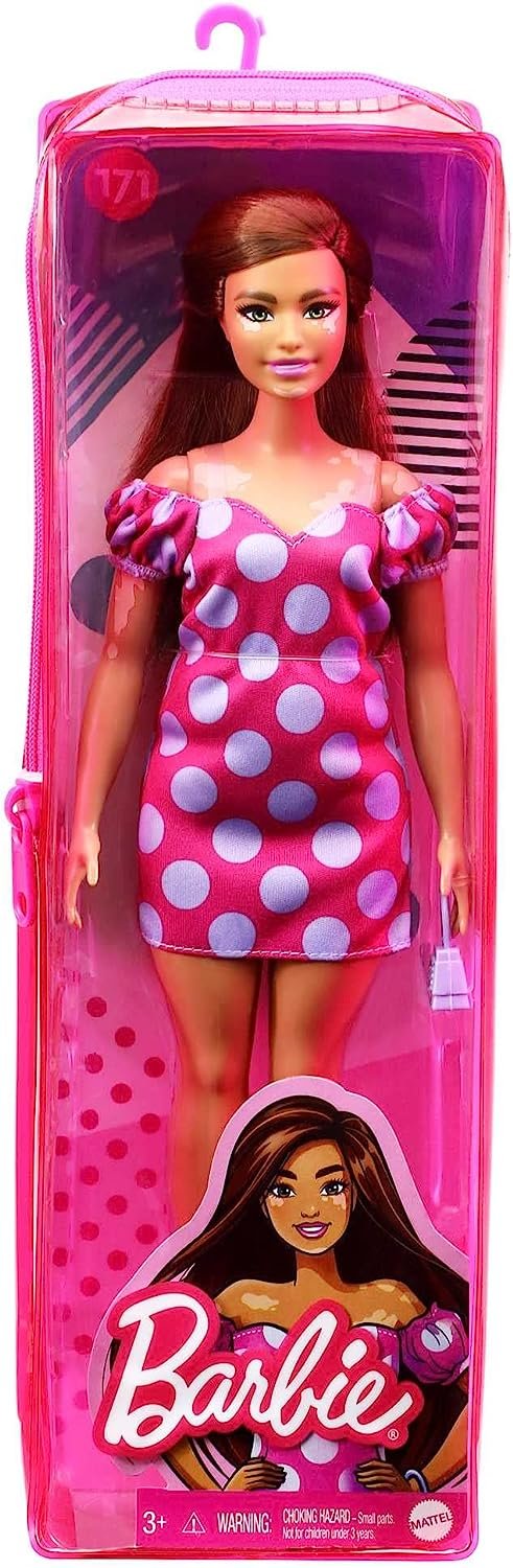 Barbie doll curvier than the original body type and wears an off-shoulder polka dot dress accented with cute puffed sleeves.