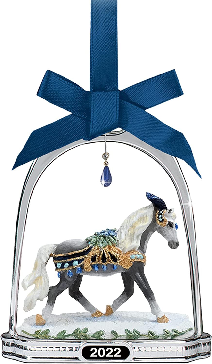 2021 Breyer holiday horse stirrup ornament - Snowbird. Enjoy our stunning 2022 Holiday Horse, Snowbird, in ornament form! A gleaming silver-toned stirrup surrounds a detailed miniature of Snowbird. His pearly grey coat is decorated with beautiful blue and gold costuming and a feathered headdress, along with a spray of evergreens.