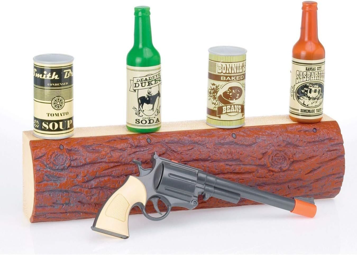 Test your target shooting skills with this fun shooting set. Bottles and cans fly off the log when hit by the harmless infrared beam that works from up to 30 feet away. Authentic Wild West saloon music. Batteries not included. Ages 5 & Up.