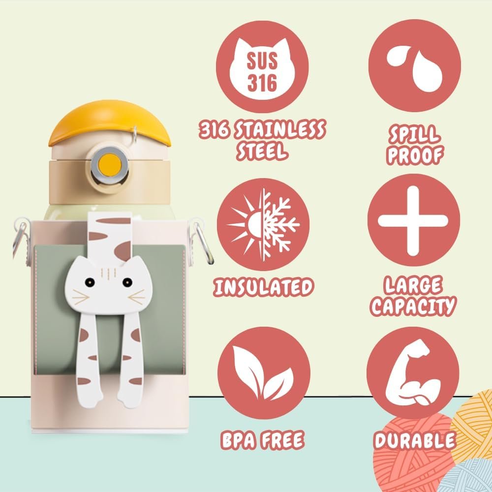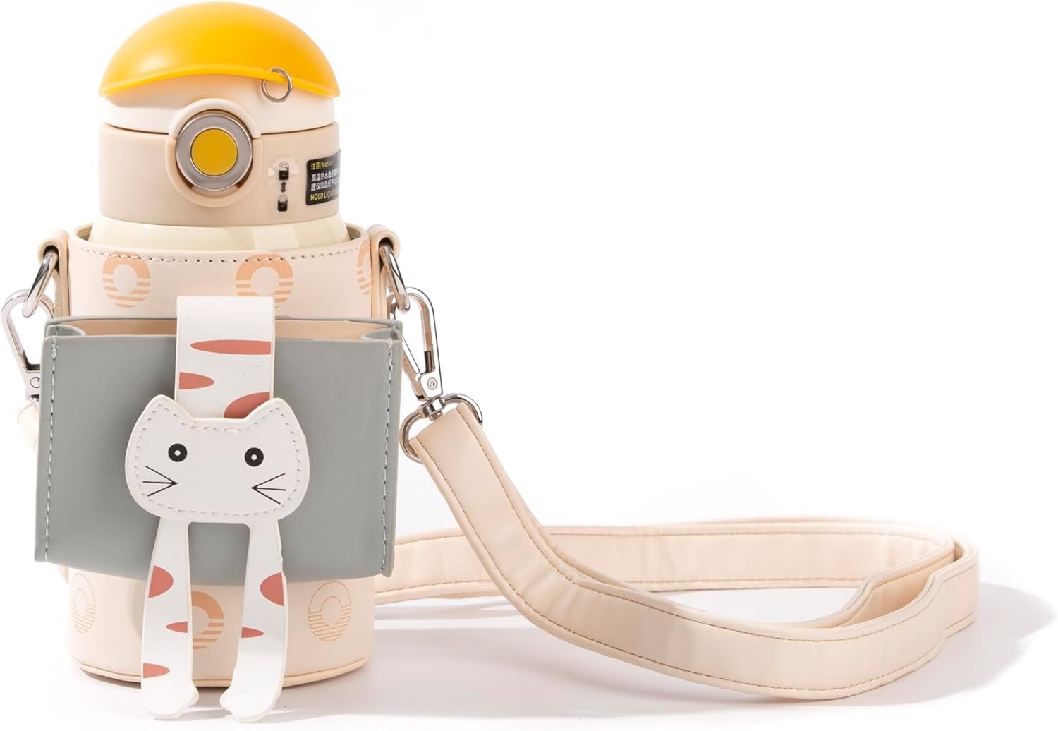Coco Cap Lying CatThermal Vacuum Insulated Water Bottle with Snap on Sleeve , Durable Design, Easy Open Button & Carrying Lanyard, Double-Walled Stainless-Steel