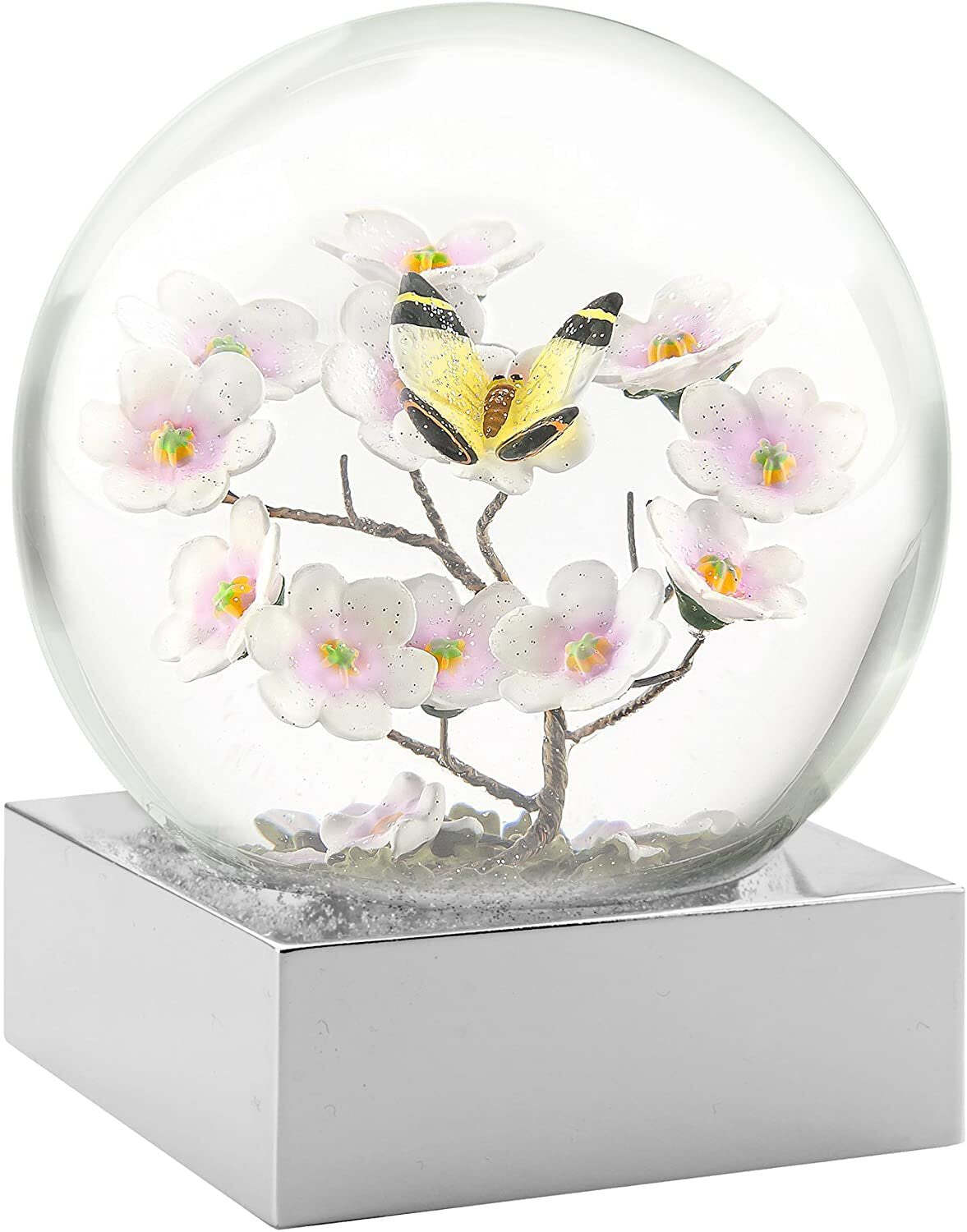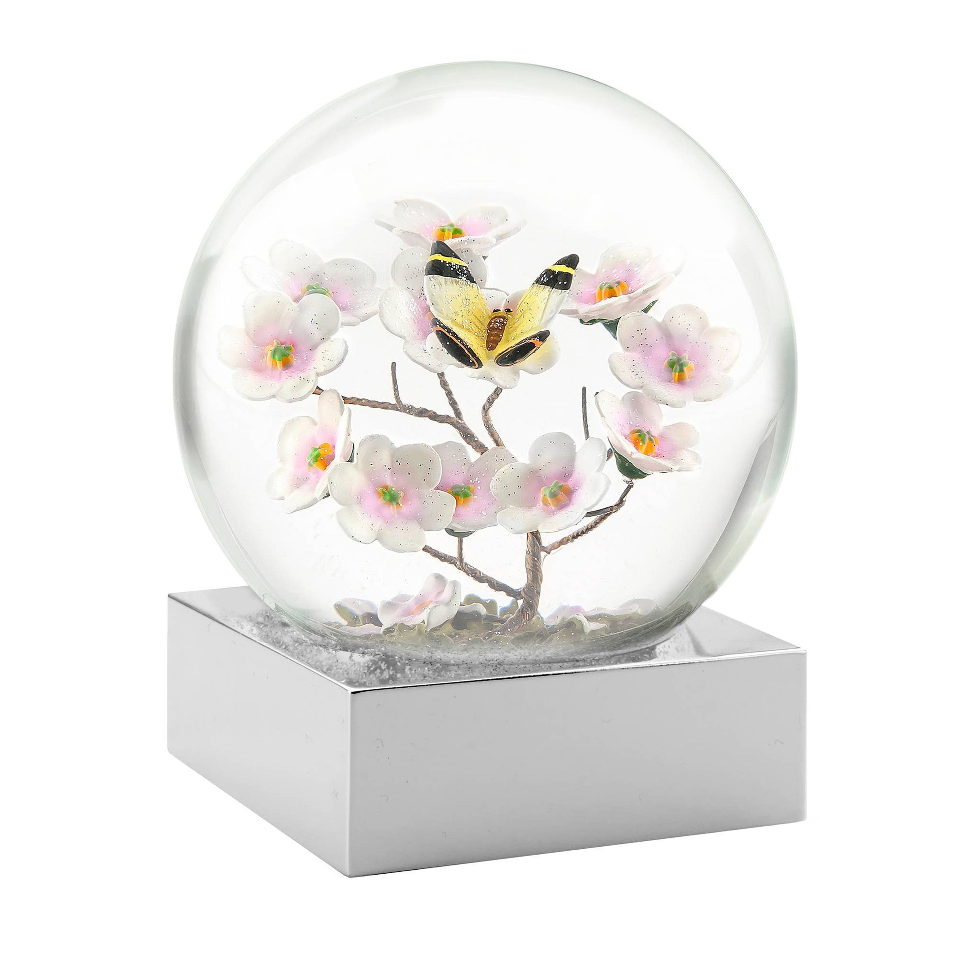 Butterfly on Branch features a butterfly landing softly on a spray of white and pink cherry blossoms. Sparkling pink snow completes the scene. Attached resin base has a silver-plated finish.