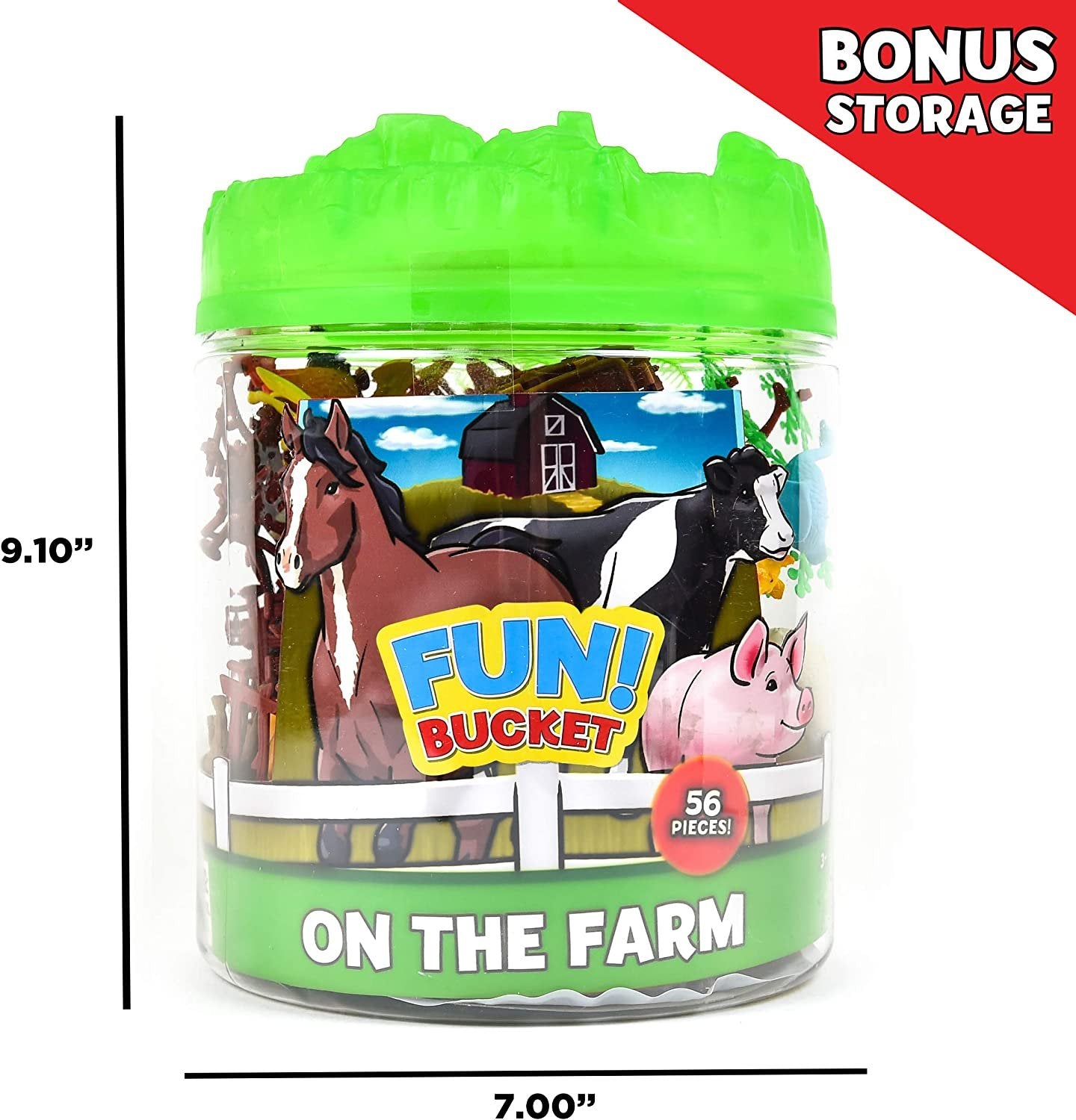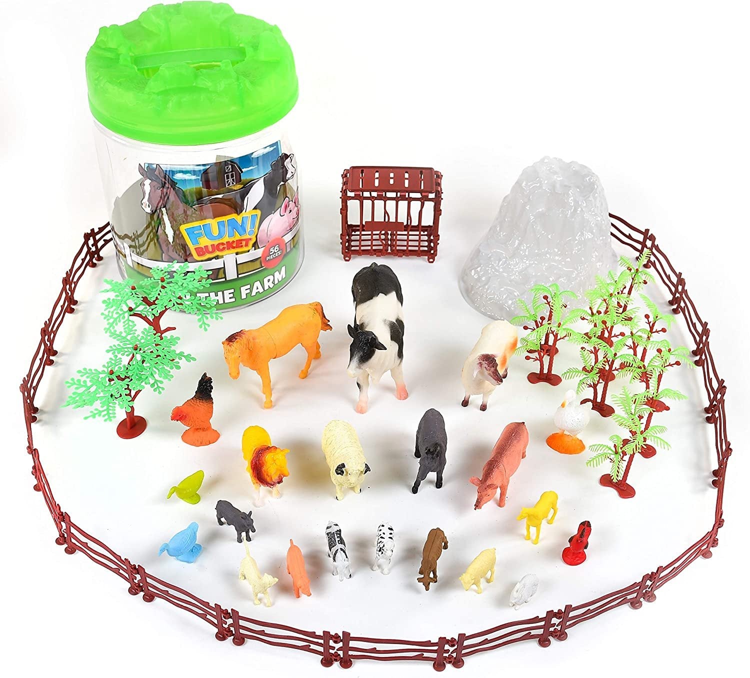 56 PIECES: This playset includes cows, horses, pigs, chickens and many other species! The different shaped trees, fencing and crate help to create a fun farmland.
