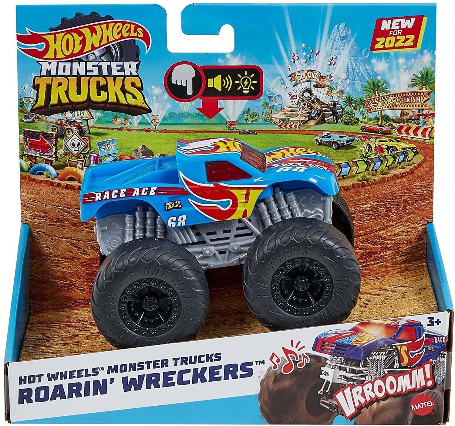 Get the full Hot Wheels Monster Truck experience with a Hot Wheels Monster Truck Roarin' Wreckers Race Ace truck as it comes to life with lights and sounds!