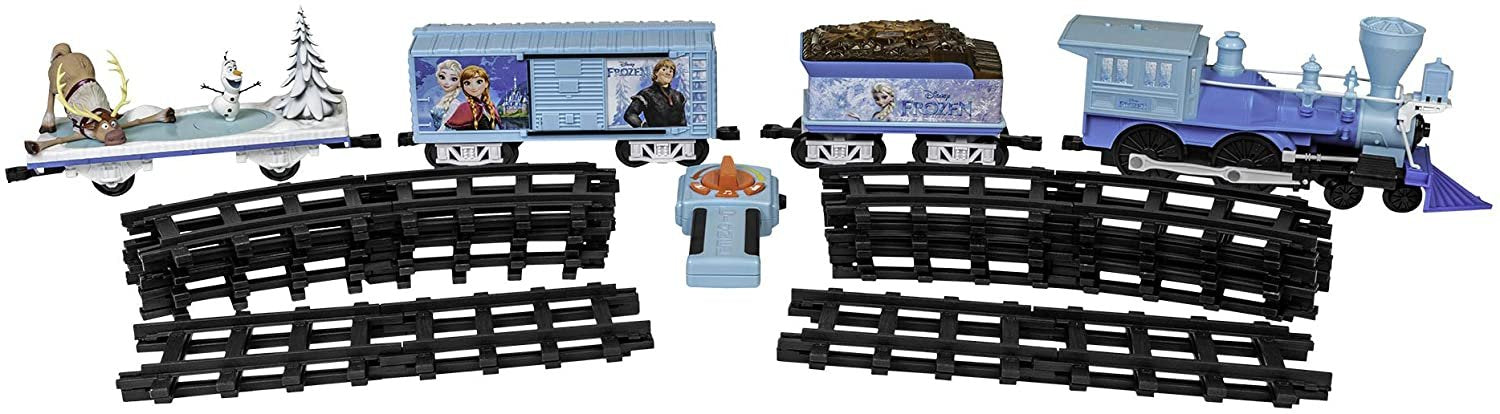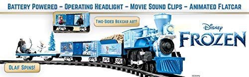 TRAIN SET FEATURES – Battery powered general-style locomotive; Authentic trains sounds, including bell and whistle; Movies sounds from Frozen; Working headlight; User-friendly remote